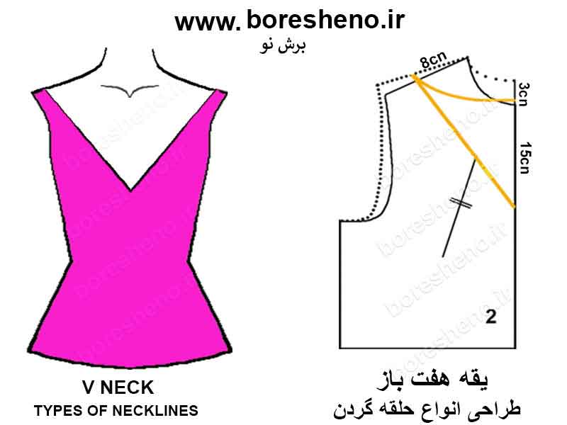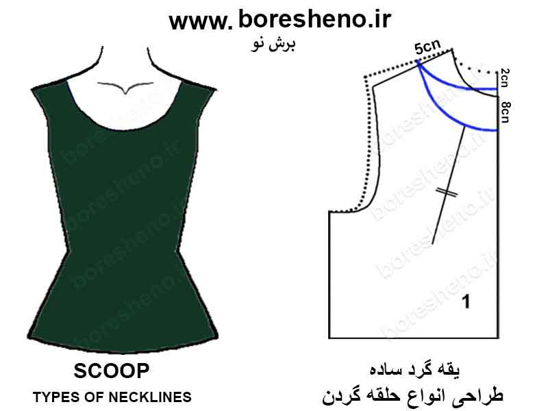 قبل از طراحی انواع حلقه گردن از نقطه سینه یک ساسون ازحلقه گردن به اندازه 1 سانتیمتر باز کنید. ساسون را ببندید. تا حلقه گردن پیش تنگتر شود. سپس طراحی انواع حلقه گردن را انجام دهید.