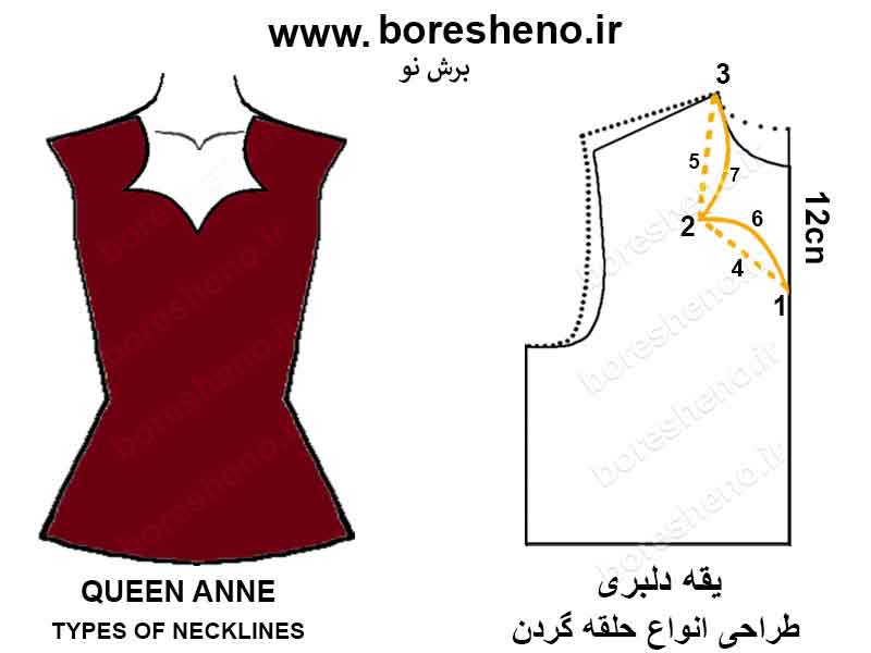 خط 1-2 و 2- 3 را نصف کنید. نقطه 4-5 از این نقاط به اندازه 2/5سانتیمتر بالا بروید. نقاط 6-7 .نقاط 1 -6 -2 و نقاط 2-7-3 را بصورت هلال بهم متصل کنید. تا طرح حلقه گردن دلبری رسم شود.
